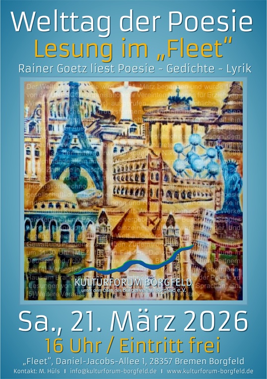 Das KULTURFORUM BORGFELD ist ein offener Zusammenschluss von Kulturschaffenden in Borgfeld und umzu. Gegründet im Januar 2007. Alle, denen ein kreatives Miteinander am Herzen liegt, die Freude an dem haben, was da ist und Neues gestalten wollen, sind willkommen.