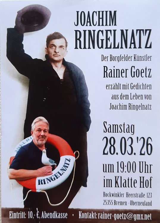 Der Borfelder Künstler RAINER GOETZ rezitiert Gedichte von JOACHIM RINGELNATZ und erzählt unterhaltsame Geschichten aus dessen Leben.